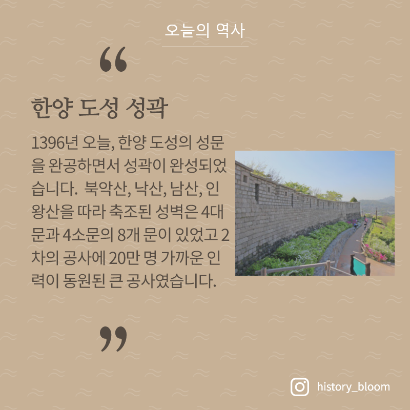 1396년 오늘, 한양 도성의 성문을 완공하면서 성곽이 완성되었습니다. 북악산, 낙산, 남산, 인왕산을 따라 축조된 성벽은 4대문과 4소문의 8개 문이 있었고 2차의 공사에 20만 명 가까운 인력이 동원된 큰 공사였습니다.